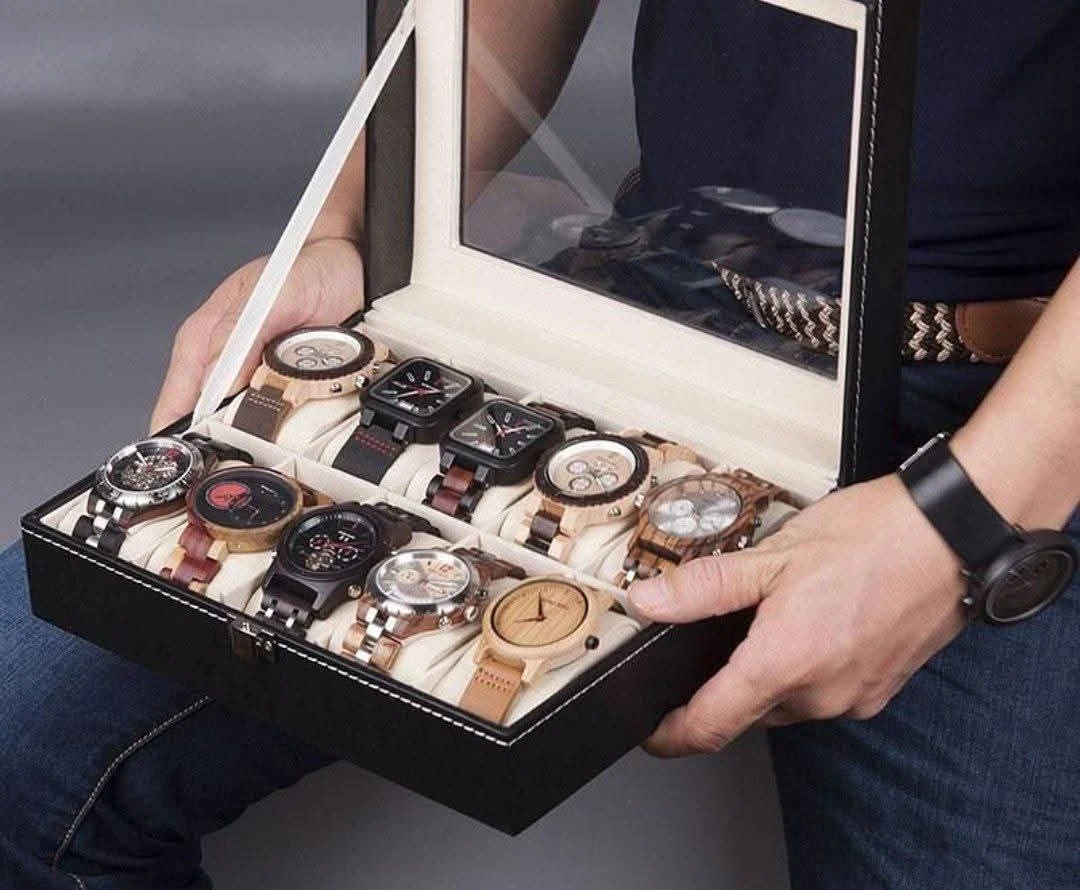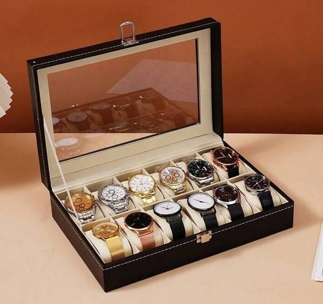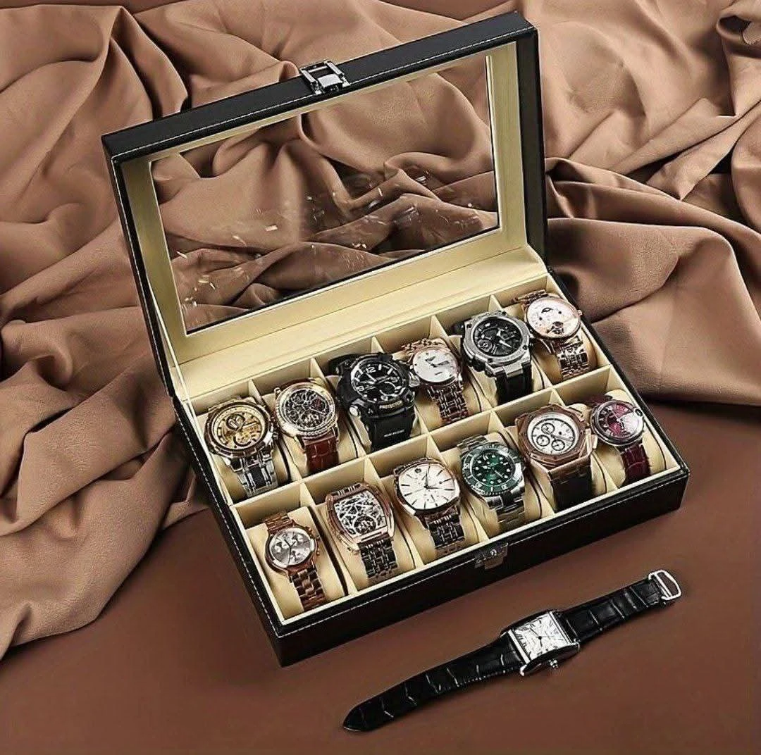 صندوق مخصص لحفظ وعرض الساعات، بتصميم أنيق من الخارج وبطانة ناعمة من الداخل، مع غطاء شفاف يتيح لك رؤية مجموعتك بسهولة ويحافظ عليها من الغبار والخدوش.