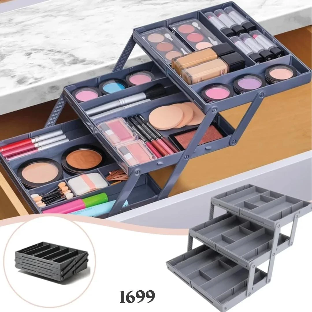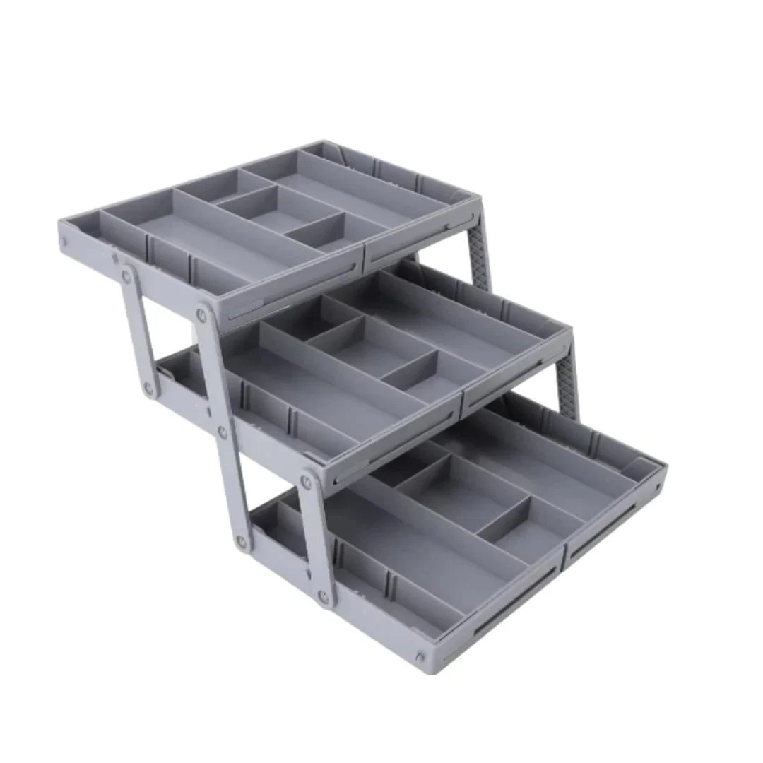 نقدم لك المنظم الثلاثي المتطور، قطعة هندسية مبهرة مصممة بذكاء لتمنحك أقصى استفادة من المساحة بأسلوب عصري جذاب. بفضل طبقاته المتعددة التي تفتح بانسيابية، ستجد كل ما تحتاجه أمام عينيك في ثانية واحدة!