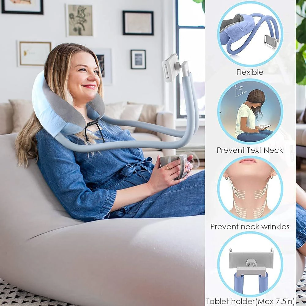 استمتع بتجربة فريدة مع حامل الهاتف المحمول المزود بوسادة رقبة ناعمة – الحل المثالي لمشاهدة الفيديوهات أو إجراء المكالمات بدون عناء. تصميم مرن وقابل للتعديل يتيح لك وضع الهاتف أمام وجهك بكل سهولة، بينما توفر الوسادة دعماً مريحاً للرقبة والكتفين.