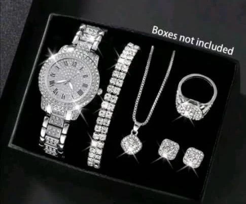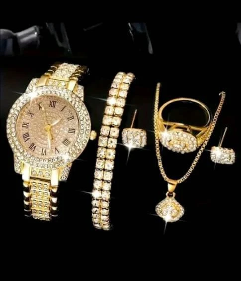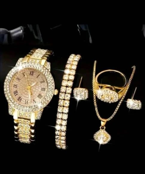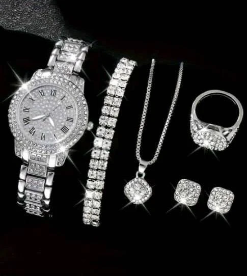 تميّزي بإطلالة ملكية مع هذا الطقم المتكامل كريستالي مبهر. الطقم يضم: ساعة أنيقة، إسوار فخم، خاتم لافت، عقد مع تعليقة راقية، وحلق بتصميم عصري — كل قطعة مصممة لتضيف لمسة فخامة لكل مناسبة 🎉