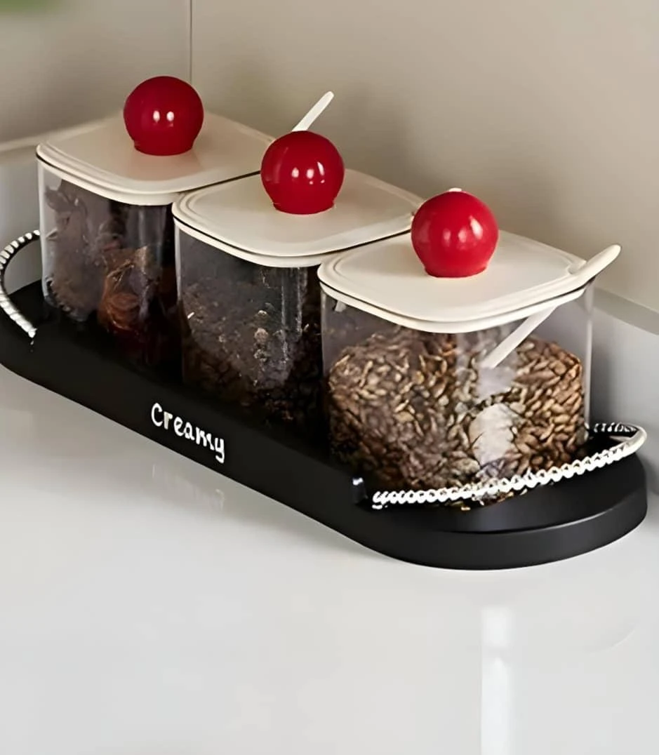 تصميم شفاف يبرز المحتوى، مع أغطية أنيقة وملاعق مدمجة لسهولة الاستخدام اليومية